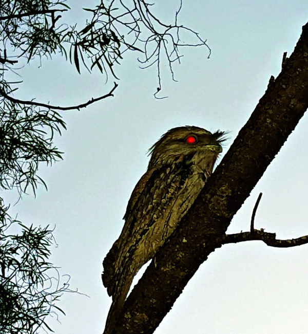 A tawny frogmouth was spotted near dusk, on the branch of the tree on the hunt for small insects.