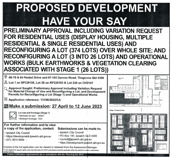 The development application was submitted to the Ipswich City Council by applicant, Sargeant Planning for display housing, multiple residential and single housing on Pindari Drive and Dances Road, Thagoona.