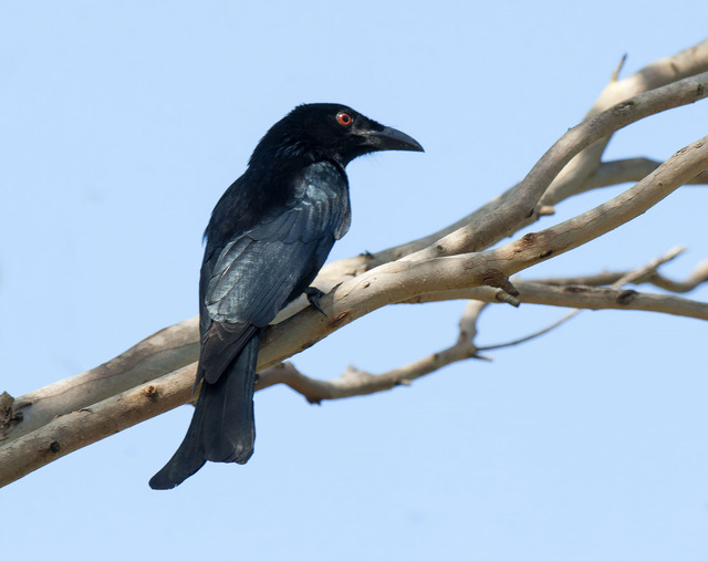 This the only drongo found in Australia (there are a lot of openings for jokes in that statement). It has glossy black feathers with iridescent blue green spots (spangles), a long, forked tail and red eyes. White spotting can also be seen on their upper wings. Found in forests and parks on their migratory flight south in late spring and north in early autumn, they feed on insects caught in flight in fascinating aerobatic displays. Nests are built of twigs, vines and grasses held in place by spider webs.