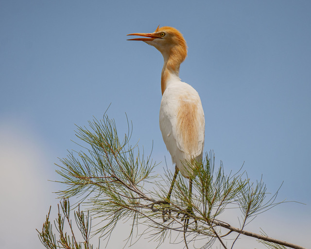 A small white heron with heavy salmon tints on its back, head and breast during breeding season. Its yellow bill also brightens and its black legs turn red or yellow. Often seen sitting on the backs of cattle – an ideal perch to hone in on insects disturbed by the beast’s hoofs. Its preference is for grasshoppers but will also eat lizards, frogs, cane toads and small mammals. Often seen in small flocks, these birds breed in colonies in swampy areas in platform nests high up in trees and bushes.