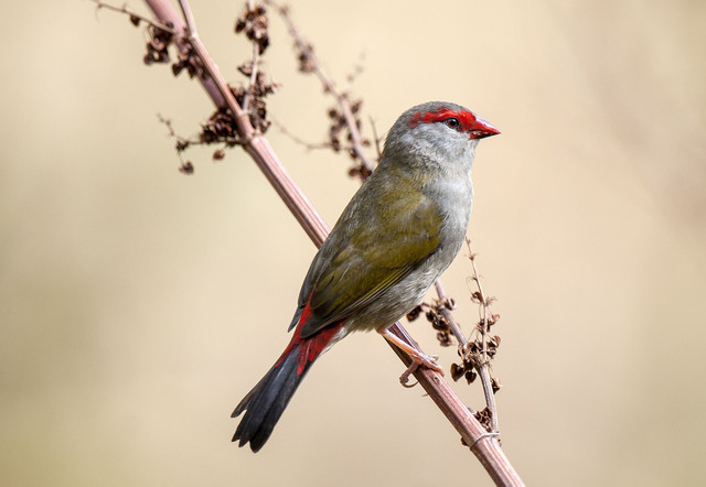 The bright red on its head, beak and tail are this finch’s call sign. It’s found in grassed areas but never too far from the protection to thick bushes. It’s one of the little birds you often see balanced on long, seeding grassheads. It also feeds on insects. Parents share nest building duties as they build a domed nest with a side tunnel as the entry. They also share feeding duties when the eggs hatch.