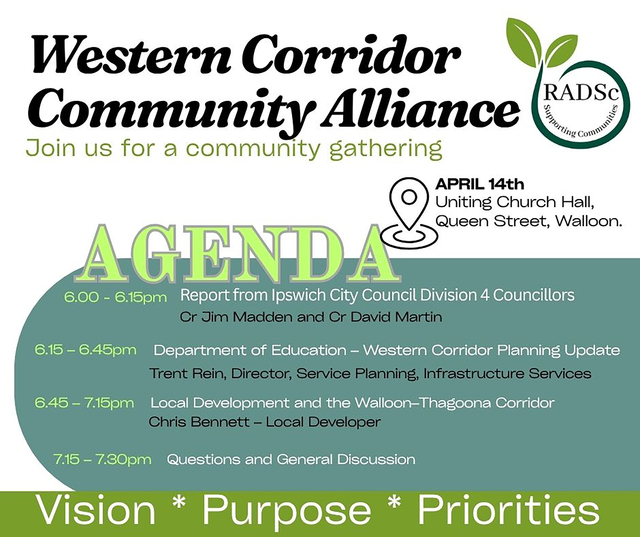 With substantial housing growth planned, the Western Corridor Community Alliance aims to provide a trusted, non‑political space for sharing factual information, designing practical responses to emerging issues, and advocating for improved transport, education, health, and community infrastructure. The Western Corridor includes Walloon, Thagoona, Rosewood, Mt Marrow, Haigslea, Tallegalla, Calvert, Ebenezer, Ashwell, and Grandchester.